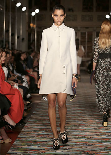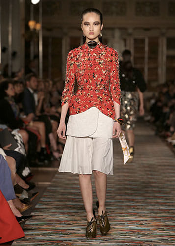 La campagne britannique est évoquée dans ce défilé par des allusions à la chasse. Le rouge suggère l’écarlate des costumes de chasse à courre. Les tweeds sont ruraux champêtres et les popelines rustiques. La Maison n’a rien laissé au hasard, allant même jusqu’à faire défiler ses mannequins sur des scènes équestres. La collection est rythmée par des soies précieuses d’Asie, des motifs picturaux, des imprimés africains, et des velours dévorés qui traduisent un esprit découvreur, une soif du monde, une excentricité bien anglaise. Chez Shoelifer, on aime les créations hybrides et fonctionnelles so Dior : les basques de l’emblématique veste « Bar » se superposent aux pantalons, aux robes, aux jupes…
